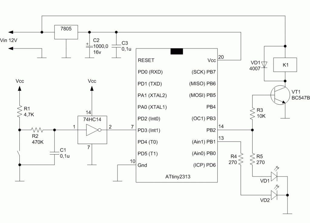 После включения мигает красный светодиод VD2. Триггер шмитта 74HC11 позволяет окончательно и бесповоротно избавиться от дребезга контактов. При нажатии  кнопки, светодиод VD2 гаснет, а VD1 (зеленый) загорается, одновременно с ним открывается транзистор VT1 и включается реле K1. При следующем нажатии нагрузка и зеленый светодиод VD1 отключаются, красный светодиод VD2 начинает мигать.  Диод VD1 защищает транзистор от всплесков напряжения на катушке реле. Собрана схема на макетной плате.